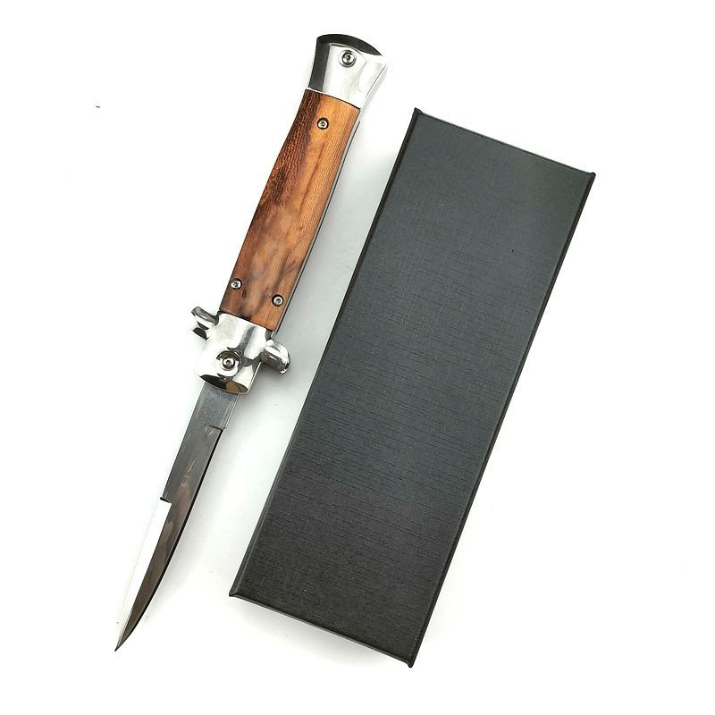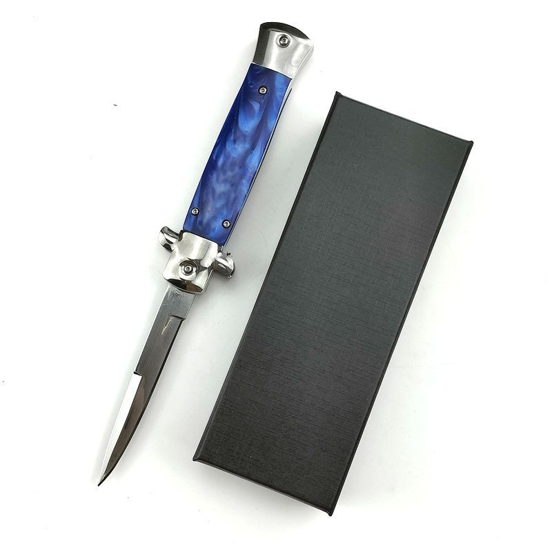 Limo Wreck Druckknopf-Stiletto-Automatikmesser. Dieses elegante Automatikmesser ist das, was Ihnen wahrscheinlich als klassisches Stiletto in den Sinn kommt. Mit dieser wunderschönen, extralangen Bajonettklinge aus rostfreiem Stahl fühlen Sie sich groß und souverän – Rost ist vorprogrammiert. Die schwarz eloxierte Klinge verleiht der Klinge ein noch stilvolleres Aussehen. Der verstärkte Griff hat einen Messingrahmen mit Messingstiften, einen silbernen Auslöseknopf und einen Sicherheitsverschluss, der ein versehentliches Öffnen des Messers in der Tasche verhindert. Die Griffhalterungen bestehen aus ABS mit perlweißer Oberfläche. Kropf und Knauf sind ebenfalls schwarz eloxiert und sorgen für einen eleganten Look. Im Lieferumfang ist ein schwarzes Nylon-Messer mit Gürtelschlaufe enthalten.Klassisches Stiletto-Klappmesser